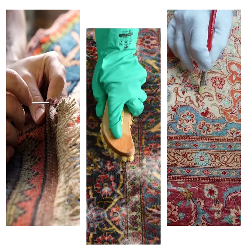 خدماتی همچون رفوگری فرش، ترمیم بیدخوردگی، ترمیم سوختگی، شیرازه دوزی، ریشه بافی، لکه برداری، رنگ برداری، دارکشی فرش، پرداخت فرش به صورت کاملا حرفه ای و تخصصی در قالیشویی ایران مهر قابل اجراست.